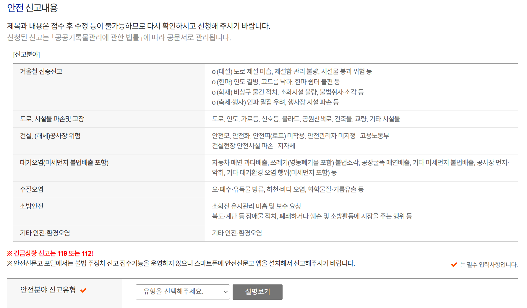 겨울철 집중신고는 대설, 한파, 화재, 그리고 겨울 축제 및 행사와 관련된 다양한 위험요소를 대상으로 합니다. 주요 신고 유형은 다음과 같습니다.