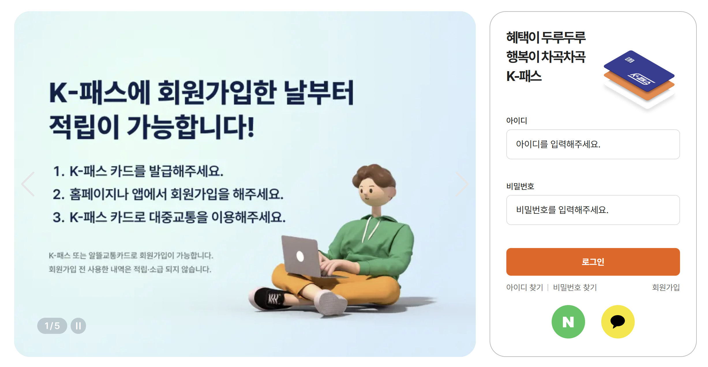 - 국내 10개 카드사가 발급하는 K-패스 카드를 사용하여 대중교통비 결제.
