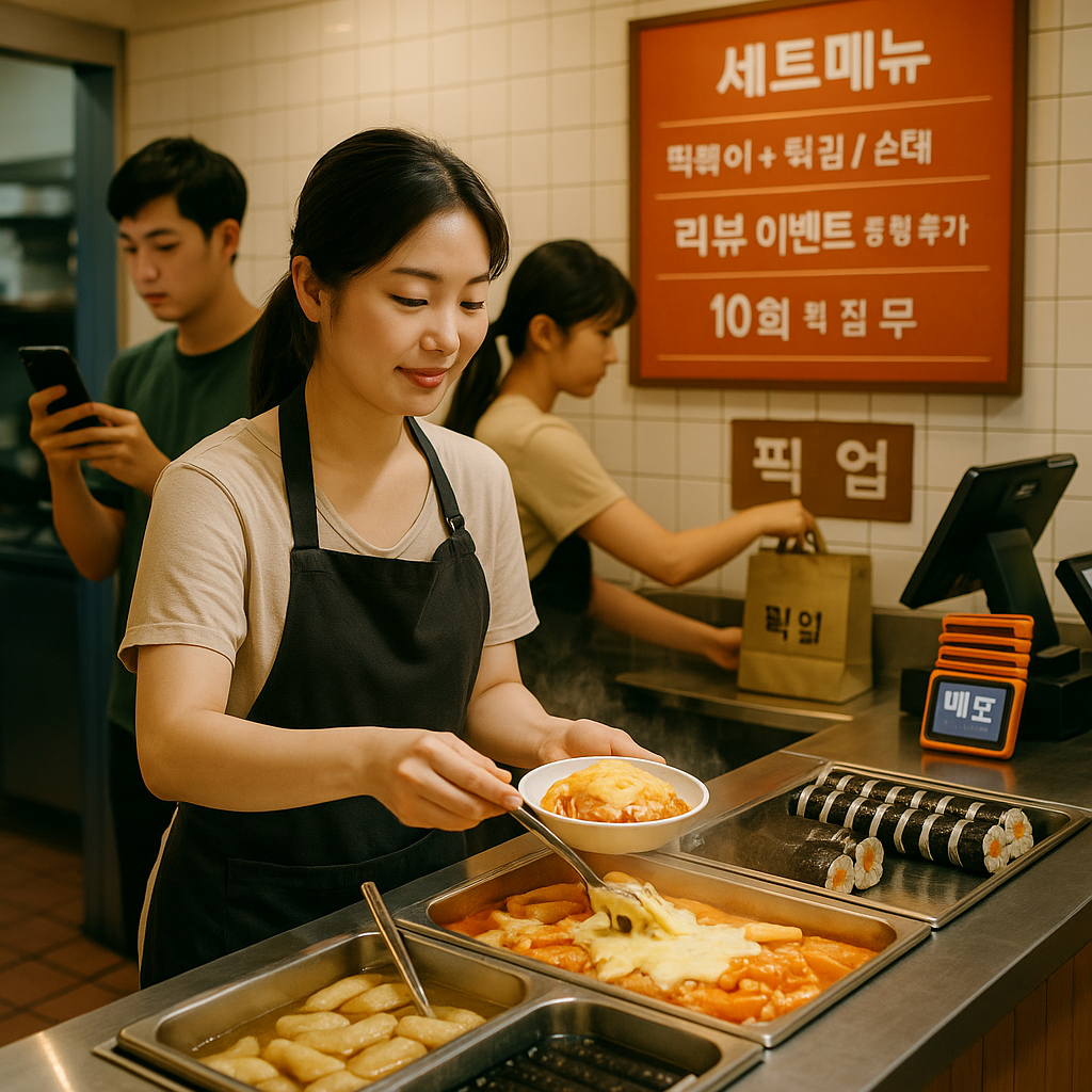 배달앱에서 자주 팔리는 조합은 ‘떡볶이+튀김+순대 세트’예요. 2024년 배민 데이터 기준 배달 매출 상위 10개 분식집은 세트메뉴 비중이 55%를 차지했습니다. 배달 단골은 오프라인 재방문으로 연결되는 경우가 많아, 온라인 전용 세트 구성이 필수입니다.