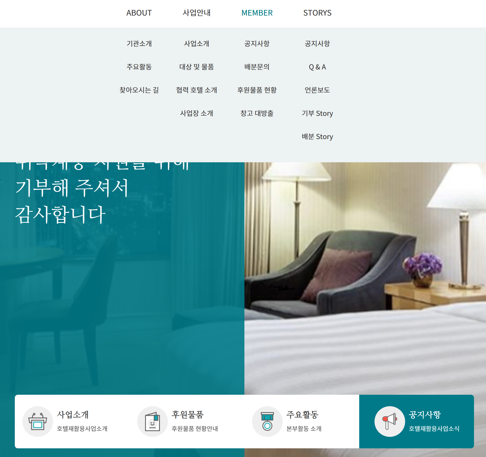 - 호텔 기부 품목: 각 호텔은 객실 개보수 시 사용이 가능한 침구류, 가구, 주방용품, 가전제품 등을 기부합니다. 이러한 품목들은 대부분 고급 품질로 구성되어 있어 주거 취약계층이 안정적인 생활을 영위할 수 있는 중요한 기반을 제공합니다.