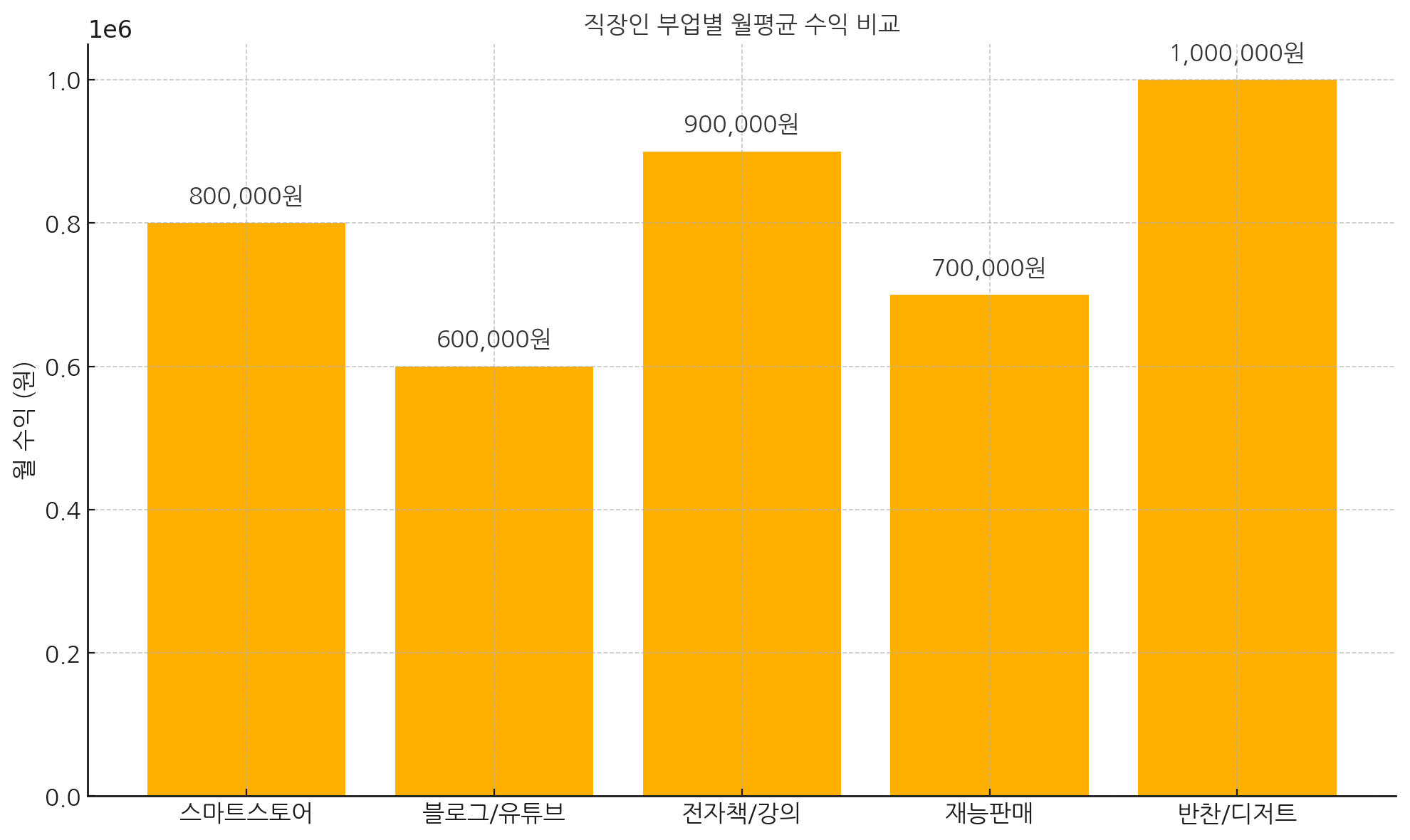 | 반찬/디저트 배달 | 요리 좋아하는 직장인 | 10~30만 원 | 지역 수요 많고 반복 구매 많음 |