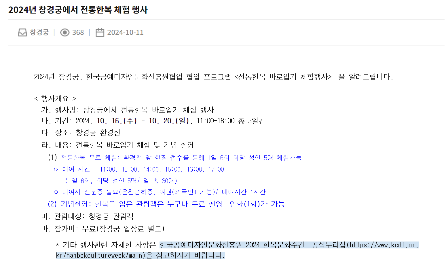 - 창경궁 한복 체험 행사 일정: 10월 16일 ~ 10월 20일, 오전 11시 ~ 오후 6시
