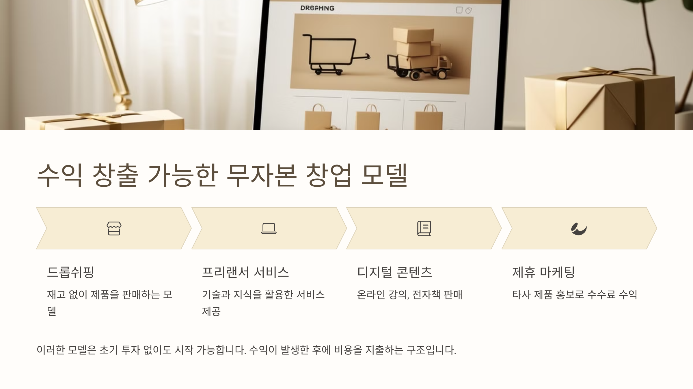무자본 창업에서 가장 흔히 떠오르는 게 바로 드랍쉬핑이죠. 재고를 들고 있지 않고 주문이 들어오면 그때서야 제품을 공급처에서 사서 배송하는 구조예요. 국내에선 위탁판매, 해외에선 알리익스프레스 기반의 쇼피파이 드랍쉬핑이 대표적이에요. 물론 단점도 있어요. 배송이 느리거나 제품 품질 이슈가 있을 수 있죠. 하지만 시장을 먼저 테스트할 수 있다는 점에서 여전히 매력적이에요.