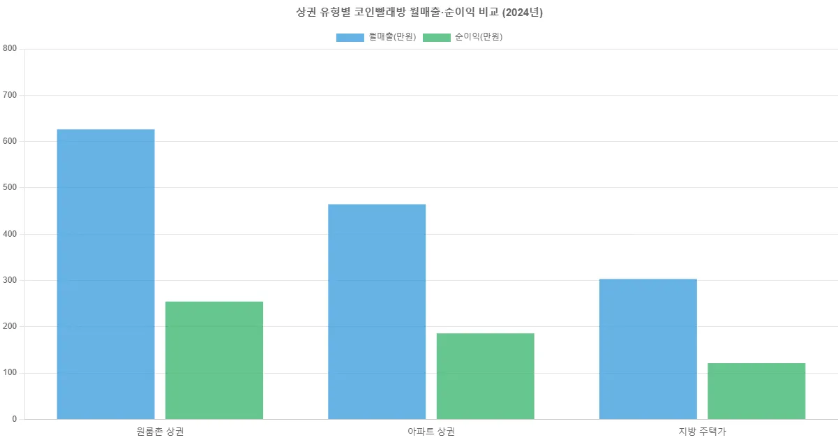 지방 중소도시의 주택가에서는 이용 빈도가 낮아 월매출이 300만~450만 원 수준에 머무르는 경우가 많습니다. 대신 임대료가 저렴하고 전기·수도 비용이 낮아 순이익률은 35~40%를 유지할 수 있습니다.