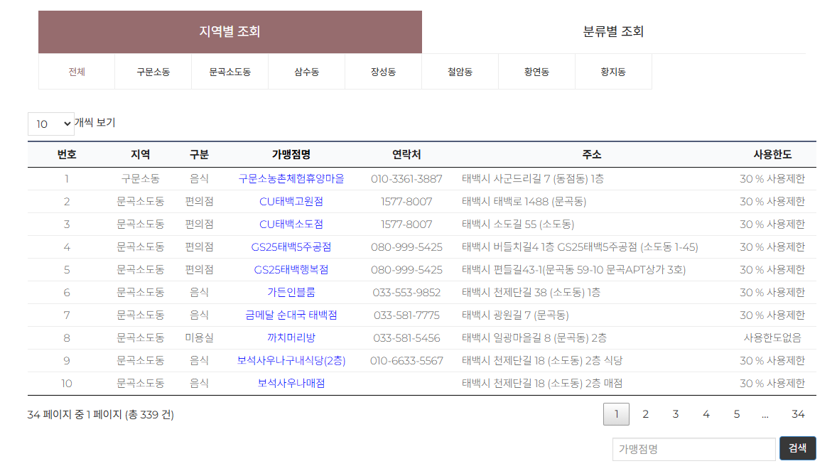 - 바우처는 태백시 내 등록된 334개 가맹점에서 사용할 수 있습니다.
