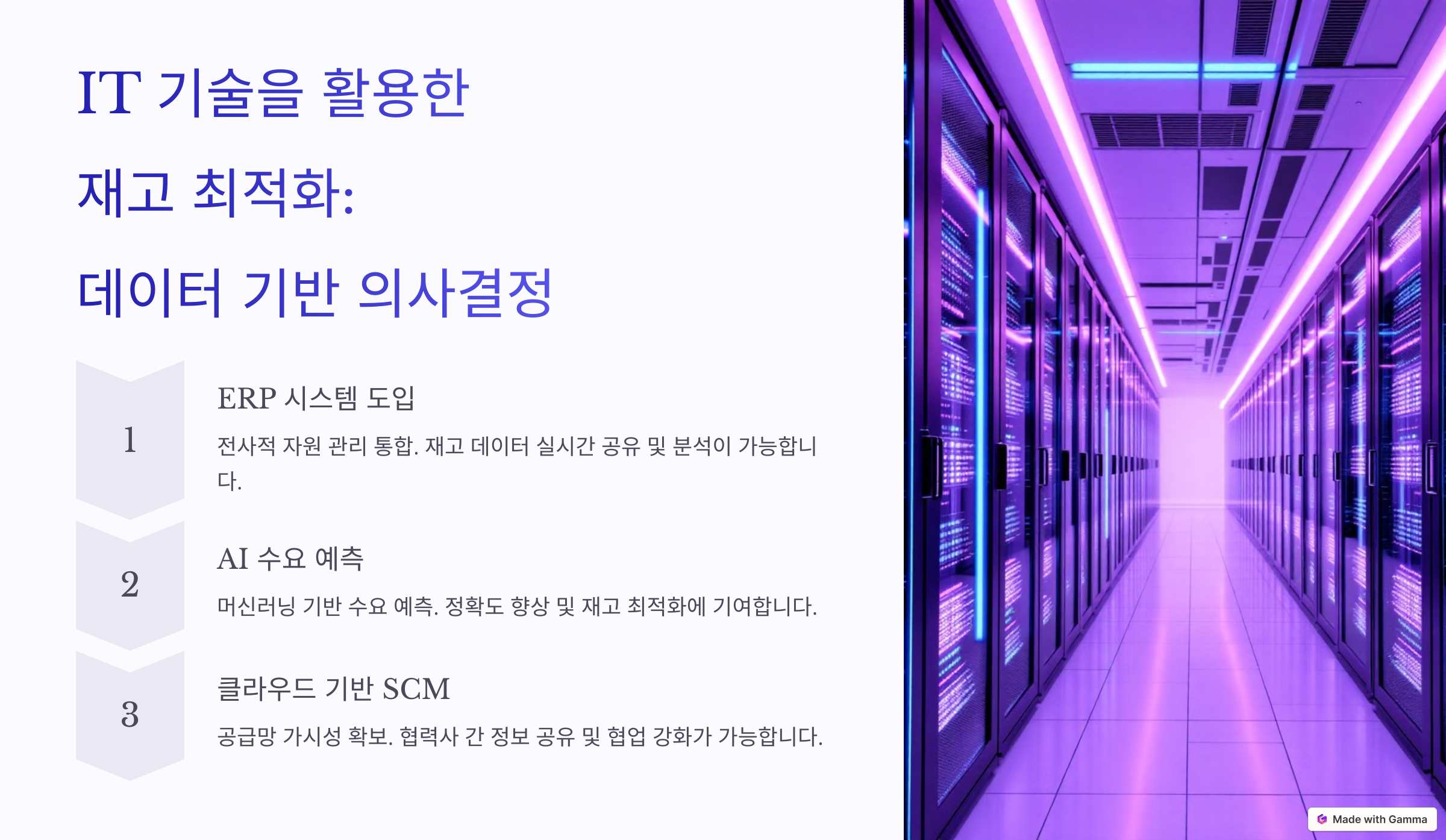 이러한 IT 기술을 활용하면 정확한 재고 관리가 가능해지고, 비용 절감과 운영 효율성을 높일 수 있어요!