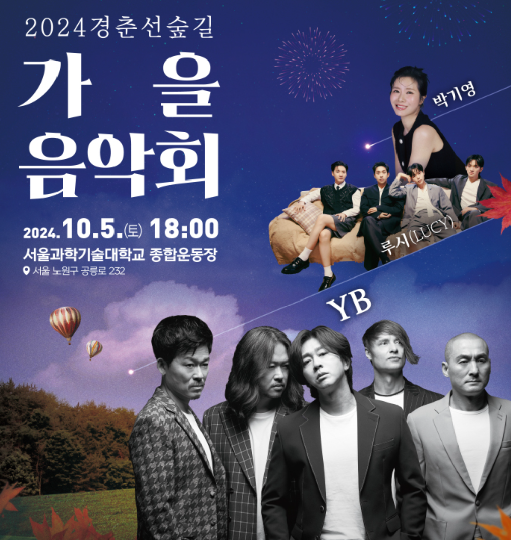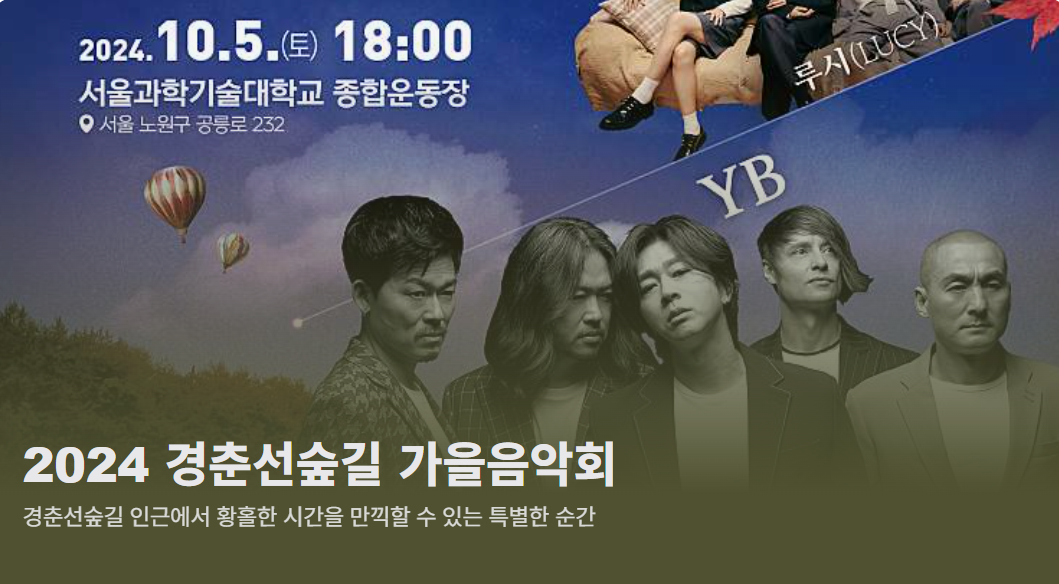 다가오는 가을, 서울 노원구에서 열리는 특별한 음악회가 많은 이들의 주목을 받고 있습니다. 바로 2024 경춘선숲길 가을음악회입니다. 가을의 선선한 바람과 함께 깊은 감동을 선사할 이번 음악회는 10월 5일(토) 오후 6시, 서울과학기술대학교 종합운동장에서 펼쳐질 예정입니다. 이번 공연에는 한국을 대표하는 록 밴드 YB, 맑고 청아한 목소리의 박기영, 독특한 음악 색깔로 인기를 끌고 있는 4인조 밴드 루시(LUCY)가 출연해 가을밤을 뜨겁게 달굴 예정입니다.