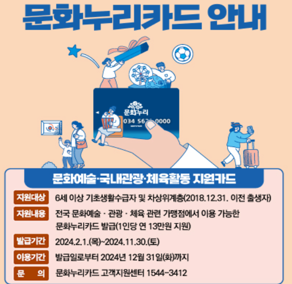 - 문화누리카드 고객지원센터(1544-3412): 발급, 충전, 사용 관련 문의 가능.
