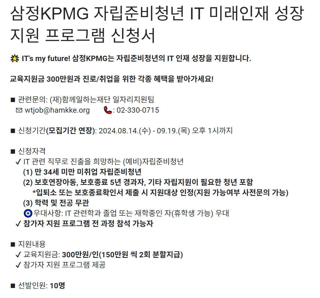 자립준비청년이 IT 분야에서 성장하고 안정적인 직업을 가질 수 있도록 돕는 삼정KPMG의 IT 미래인재 성장지원 프로그램은 그들의 밝은 미래를 위한 훌륭한 기회입니다. 지금 바로 신청하고, IT 분야에서 자신의 꿈을 펼쳐보세요.