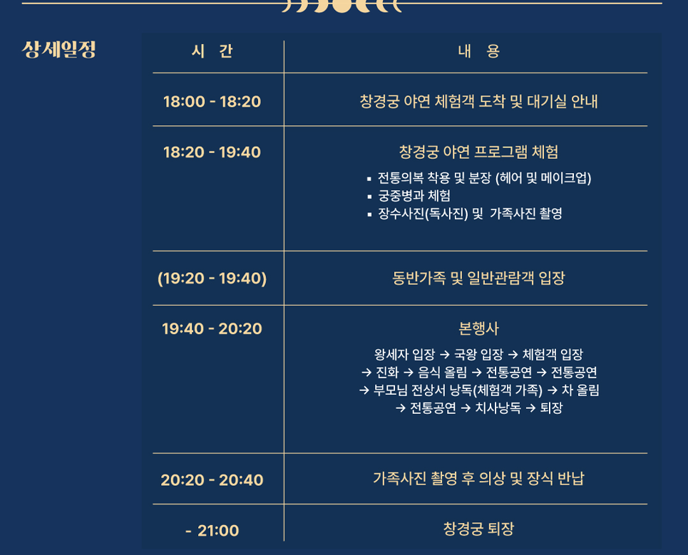 '창경궁 야연'은 조선시대 순조 때 왕세자였던 효명세자가 아버지 순조를 위해 마련한 연향, 즉 밤에 열리는 연회에서 영감을 받아 기획된 행사입니다. 이 전통적인 궁중 연향을 현대적으로 재해석한 '창경궁 야연'은 2021년에 처음 시작된 이래, 매년 많은 관객에게 역사와 문화적 감동을 선사하며 큰 인기를 끌고 있습니다. 올해 열리는 2024년 추석 연휴 기간에는 가족 단위의 관람객을 대상으로 한 다양한 프로그램이 마련되어 있어, 부모와 자녀가 함께 즐길 수 있는 특별한 경험을 제공합니다.
