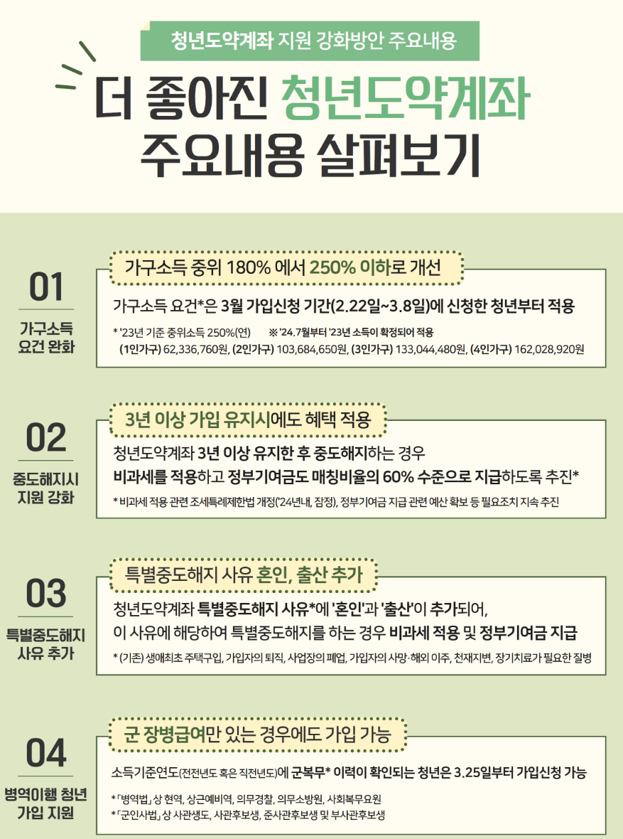- 연 소득 2,400만 원 이하의 청년은 본인이 저축한 금액의 최대 6%를 기여금으로 받을 수 있습니다.