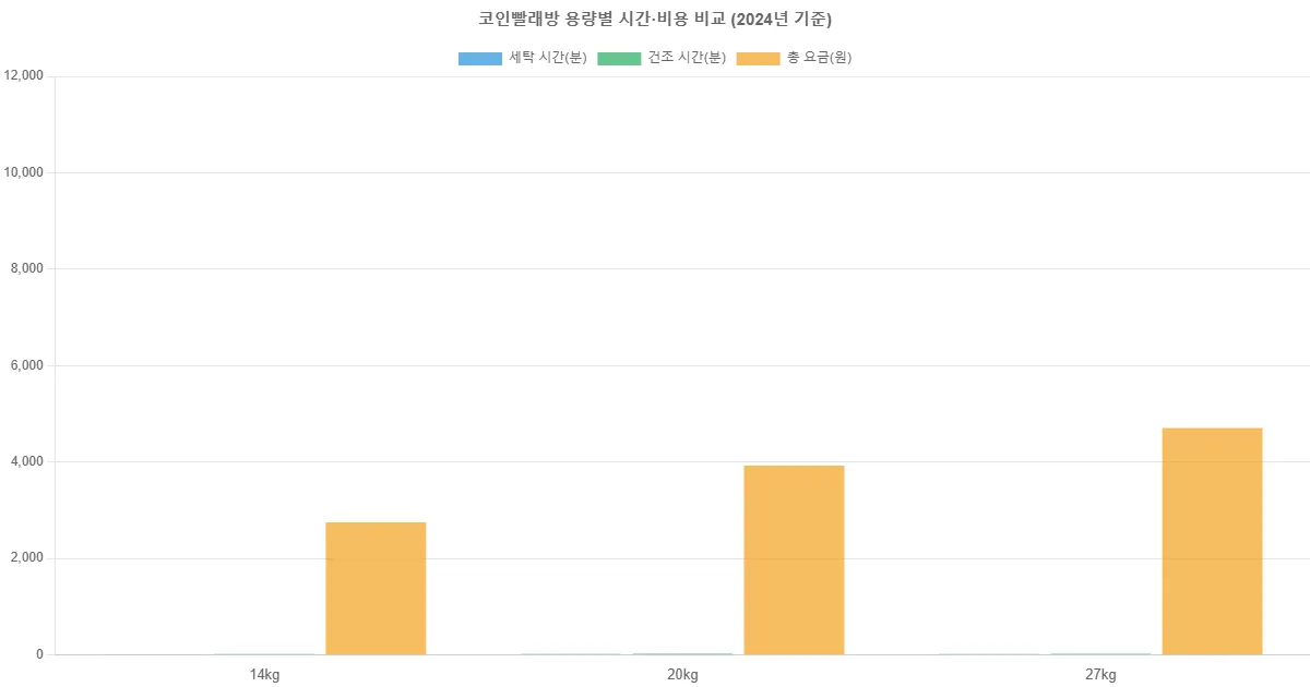세탁 요금은 기계 용량과 매장 위치에 따라 다르지만, 14kg급은 4,000~5,000원, 20kg급은 6,000원 내외, 27kg급은 7,000원 이상입니다. 건조기의 경우 10분당 1,000원이 일반적이며, 여름철이나 건조 효율이 높은 기계는 30분으로도 충분하지만 겨울철 두꺼운 이불은 50분 이상 필요합니다.