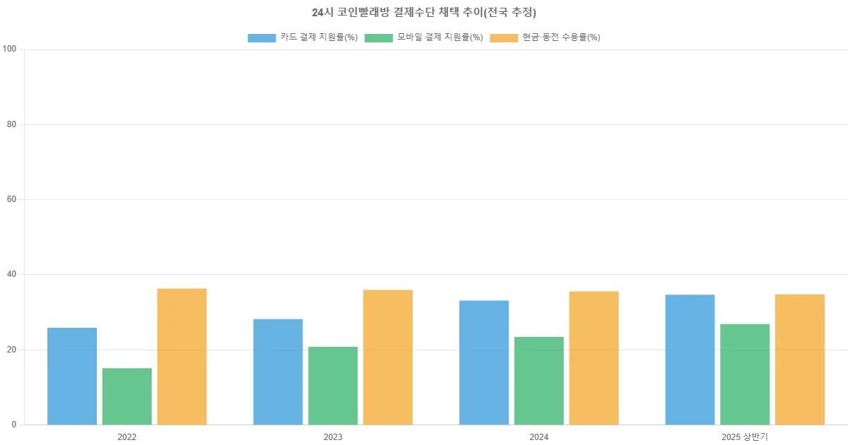 서울, 경기 등 수도권의 코인빨래방은 90% 이상이 카드·모바일 결제를 지원합니다. 반면 지방 소도시나 읍·면 단위 매장은 현금(동전) 결제 비중이 여전히 60% 이상입니다. 이는 네트워크 인프라와 매장 설치 연도 차이에서 비롯됩니다.